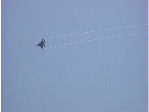 F15による低空からの急速引き起こし,湿度が高いためか低空でも飛行機雲発生〔実は左が上なんです〕