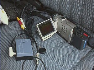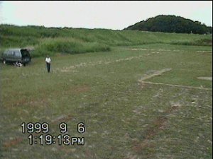 1999.9.6 今日はハンディーカムをヘリに積んでみました。左が重いのでエルロンのトリムが半分くらいずれましたが,案外簡単にできました。